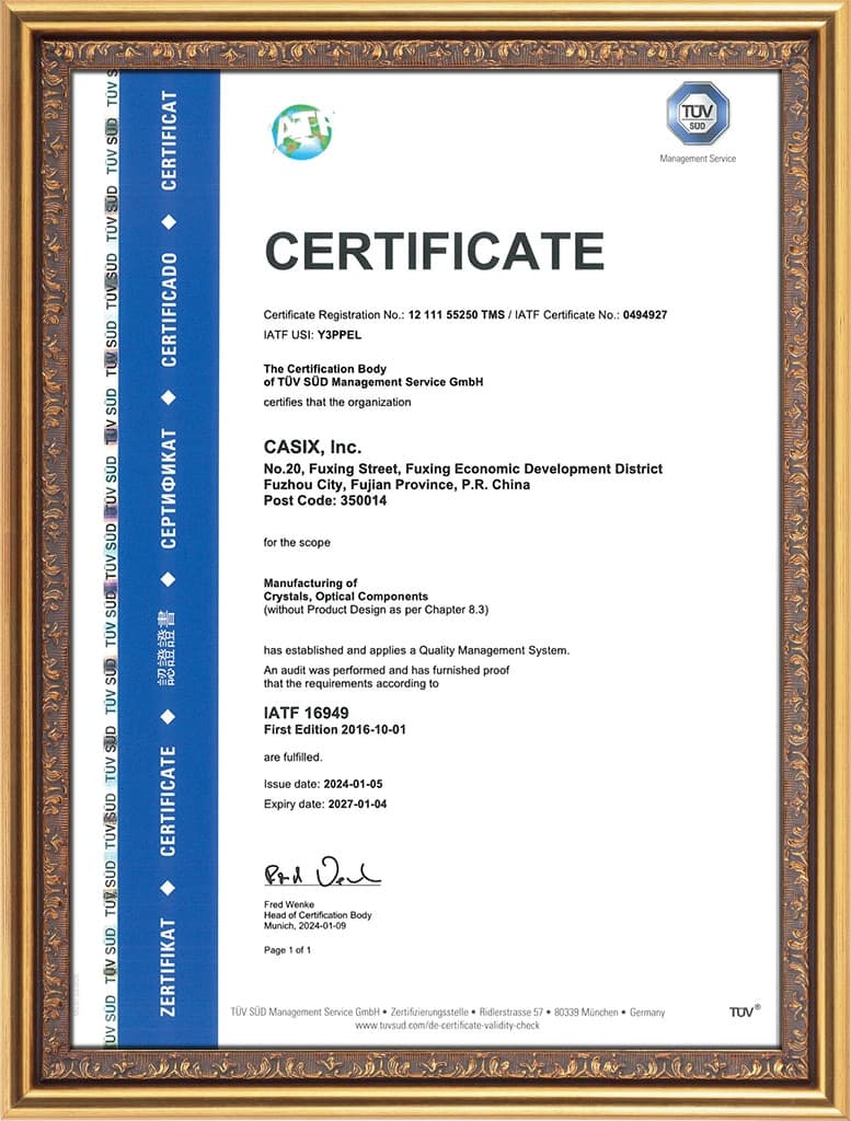 Casix Inc., founded in September 1992, are recognised as a leading manufacturer of precision optics for applications in automotive, biomedical, telecom, laser and instrumentation. By adhering to the spirit of "safety, unity, dedication, innovation and excellence" together with international advanced management philosophies, over 1400 employees are dedicating to satisfying the needs of our customers and target markets in terms of performance and cost effectiveness.